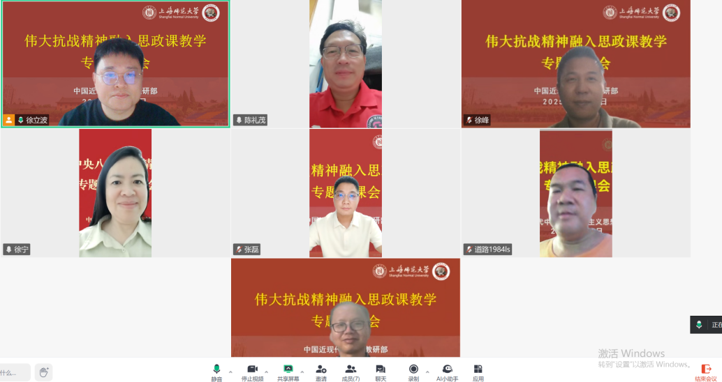 中国近现代史纲要教研部通过腾讯会议平台举行线上集体备课会,由教研部主任徐立波主持。徐剑雄、桂强老、陈礼茂、徐宁等老师结合课程目标、教学内容、教学重难点,就如何将伟大抗战精神有机融入中国近现代史纲要课程教学提出了一系列建设性建议。徐立波、王亮、徐峰、张磊等提出,应加强对中国近现代史上重大历史事件与当代社会发展关联性的讲解,引导学生深刻理解抗战精神不仅是民族记忆,更是驱动今日中国发展、激励青年担当的强大精神动力,切实增强课程的时代感与育人实效。