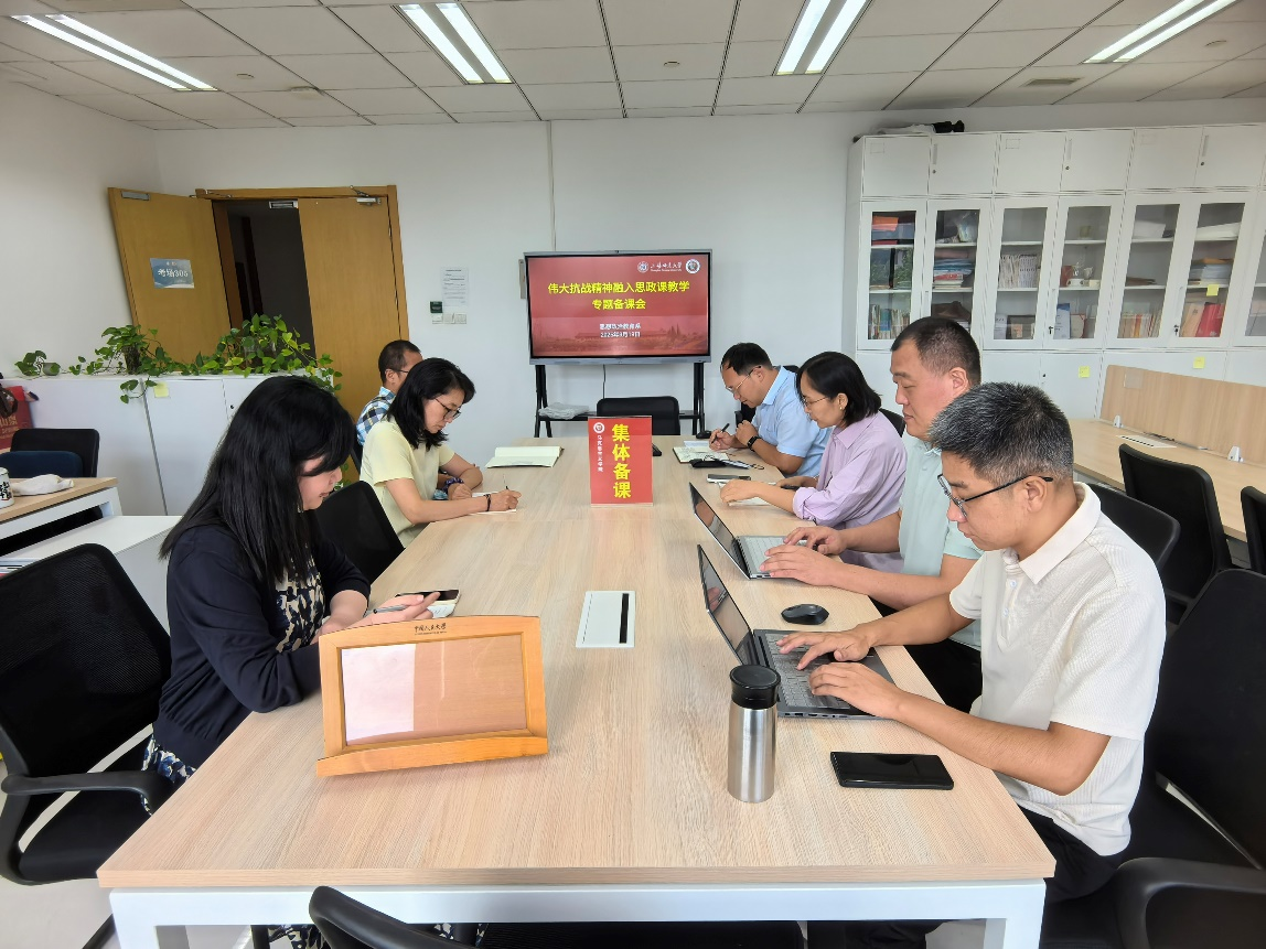 习近平新时代中国特色社会主义思想概论教研部集体备课会在文科实验楼403室举行,教研部主任谢江平主持。院长张志丹指出,要深刻领会讲话中关于抗战精神的历史地位、重大意义以及新时代弘扬抗战精神的实践要求,为将抗战精神有机融入习近平新时代中国特色社会主义思想概论课程教学筑牢理论根基。教研部教师们围绕教学目标和教学内容,就伟大抗战精神融入思政课教学的意义、方法和途径等问题进行深入研讨。大家一致认为,要在思政课教材中寻找与伟大抗战精神的契合点,将抗战精神的内容有机融入相关章节的教学中,让学生更好地了解中国人民抗日战争的历史脉络,铭记历史教训,珍惜和平生活,激发学生为实现中华民族伟大复兴而努力学习的内生动力。