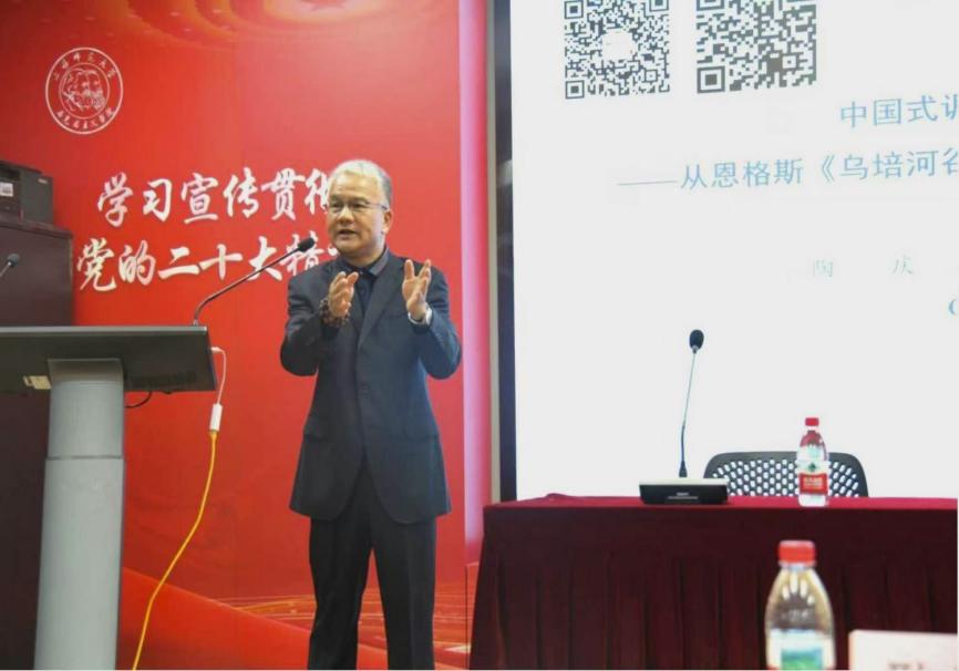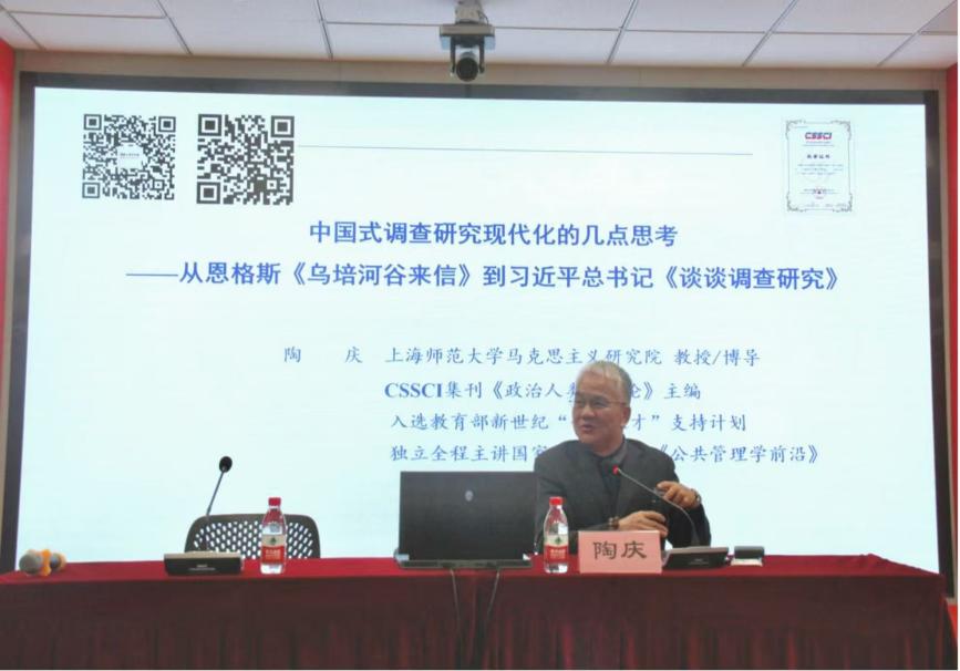 2025年10月30日傍晚6点,太阳集团官网8722“明德讲坛”系列讲座如期在文科实验楼202室开讲。太阳集团城娱8722哲学与法政学院教授、太阳集团城娱8722马克思主义理论博士生导师、博士后合作导师陶庆应邀作了题为《中国式调查研究现代化的几点思考——从恩格斯〈乌培河谷来信〉到习近平总书记〈谈谈调查研究〉》的讲座。受太阳集团官网8722院长张志丹教授委托,此次讲座由程胜荣博士主持,我院2024级与2025级的全体博士研究生和硕士研究生,以及哲学与法政学院部分硕士研究生参加。