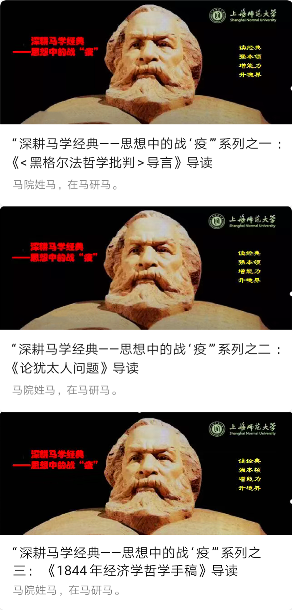 近期我院许多党员教师,在全体研究生中开展“深耕马学经典——思想中的战‘疫’”的系列导读活动,帮助学子们调整学习状态,提升思想境界,在经典文本中汲取养分、增强本领。该活动目前已推出三期,分别有周书俊教授在第一期导读活动中推荐大家阅读《<黑格尔法哲学批判>导言》、张正光教授在第二期导读推荐大家阅读《马克思<论犹太人问题>研究读本》、《解放的图景:马克思<论犹太人问题>如是读》、《犹太人问题与人的解放的逻辑进路》等著作。第三期导读活动中,吴宁教授推荐大家阅读《1844年经济学哲学手稿》这部著作。让研究生们在家也能好好研读学术著作经典,提升理论素养,做好学术研究。